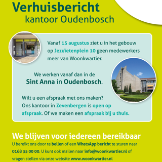 Sinds 15 augustus ziet u in het gebouw op Jezuïtenplein 10 geen medewerkers meer van Woonkwartier. We werken vanaf dan in de Sint Anna in Oudenbosch. Wilt u een afspraak met ons maken? Ons kantoor in Zevenbergen is open op afspraak. Of we maken een afspraak bij u thuis.