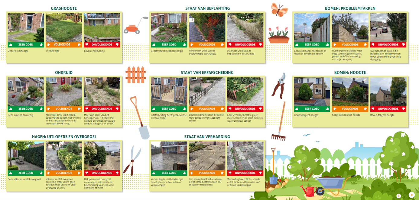 U vindt hierboven met behulp van plaatjes wat wij verwachten van uw tuin. Een groene kleur betekent zeer goed, oranje voldoende en rode kleur onvoldoende. Dit staat ook in de brochure. Klik op de link in dit artikel om de brochure te lezen.