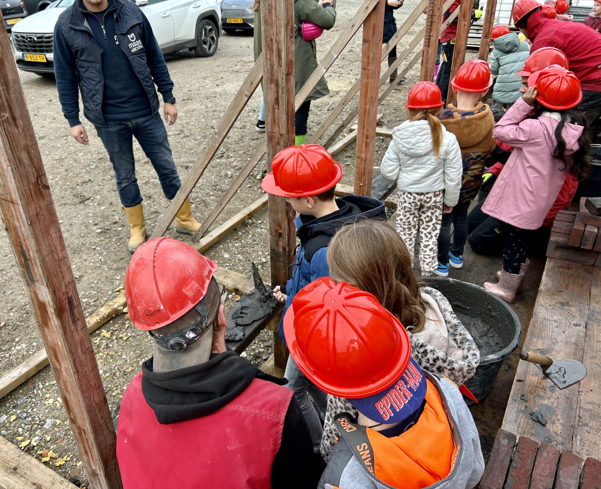 Na de presentatie krijgen alle kinderen een stoere Maas Jacobs-bouwhelm op. “Mogen we deze bouwhelm houden?” Jazeker! En gaan we de bouwplaats op. Een groepje kinderen gaat aan de slag met het metselen van een muurtje. Andere kinderen krijgen eerst een rondleiding. En weer een ander groepje gaat leidingen leggen. Oftewel draadjes trekken zoals ze dat noemen in de bouw. En dan is het tijd voor de groepjes om te wisselen.