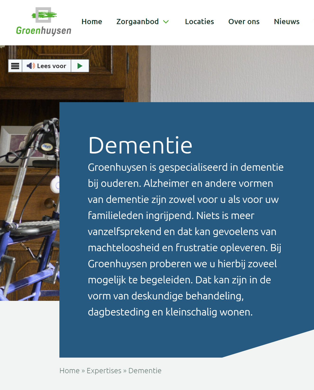 Groenhuysen is gespecialiseerd in dementie bij ouderen. Alzheimer en andere vormen van dementie is ingrijpend. Zowel voor de bewoners als voor de familieleden. Niets is namelijk meer vanzelfsprekend. En dat kan gevoelens van machteloosheid en frustratie opleveren. Groenhuysen probeert hierbij zoveel mogelijk te begeleiden. Dat kan zijn in de vorm van deskundige behandeling, dagbesteding en kleinschalig wonen. Zo biedt Kroonestede een beschermde, veilige en aangename leefomgeving. Bewoners krijgen hier alle hulp die nodig is.