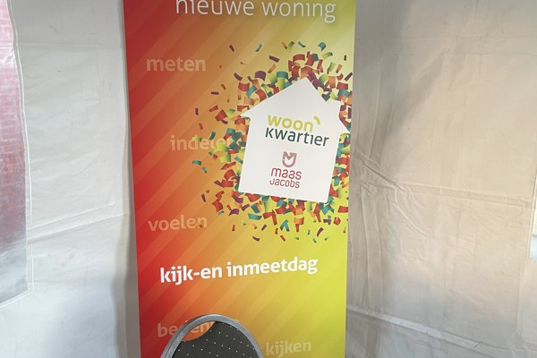 Na een warm ontvangst in de tent, volgen de nieuwsgierige toekomstige bewoners de verhuurmakelaars door hun woning. Ze stellen enthousiast veel vragen. Noteren technische aspecten. En meten hun woning met de Woonkwartier-rolmaat.