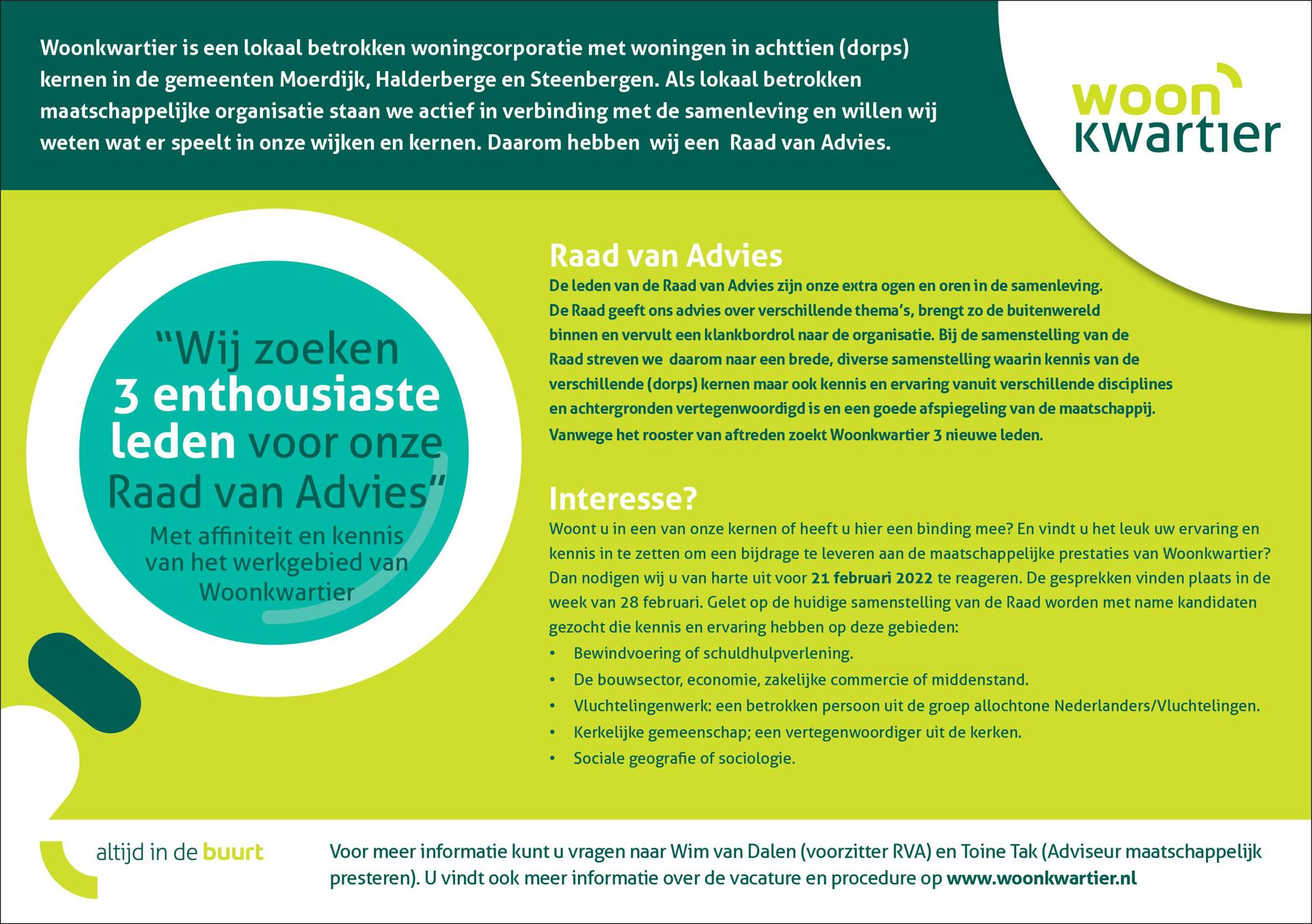 Woonkwartier is een lokaal en maatschappelijk betrokken woningcorporatie in West-Brabant. We beheren zo’n 9.000 woningen in achttien (dorps)kernen in de gemeenten Moerdijk, Halderberge en Steenbergen. Woonkwartier wil midden in de samenleving blijven staan. Woonkwartier zoekt daarom actief verbinding met de samenleving. Dat doet Woonkwartier in haar dagelijkse werkzaamheden, met de huurders en stakeholders in de wijken en kernen waarin Woonkwartier werkzaam is. Woonkwartier heeft daarnaast regelmatig contact met stakeholders op strategisch niveau, zoals gemeenten en zorginstellingen. Maar daarnaast wil Woonkwartier de samenleving ook op strategisch niveau gestructureerd invloed laten uitoefenen. De vorm die Woonkwartier daarvoor heeft gekozen is een Raad van Advies. Ten opzichte van andere stakeholders is het grote verschil in het initiatief: dat ligt fundamenteel bij de samenleving. De Raad van Advies is van, voor en door de samenleving, Woonkwartier luistert.